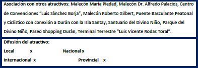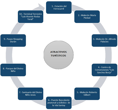 Esta escasez de información para la promoción de los atractivos turísticos incide que dichos lugares no sean visitados frecuentemente, lo que impacta en el desarrollo económico y nivel de vida de la población. En la Figura 2 se pueden apreciar los atractivos turísticos más populares del Cantón Durán.