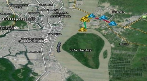 La cicloruta partirá desde la estación del tren de Durán, donde habrá dos vías por donde el ciclista desee transitar, cada ruta se la ha dividido en dos colores, en la Figura 4 se puede observar el recorrido que posee.