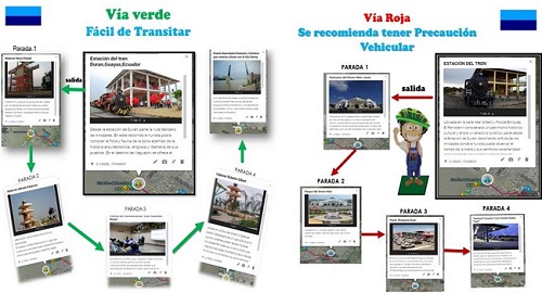Uniendo las dos vías, se tiene una distancia total de 8.05 km a recorrer con un tiempo de duración de 3 horas; el objetivo es que el ciclista visite cada uno de los atractivos turísticos que están dentro de la cicloruta con el fin de dar a conocer lugares maravillosos que posee este cantón de la provincia del Guayas. En la Figura 5 se puede identificar los colores de las rutas a transitar y los atractivos turísticos por donde pasará.