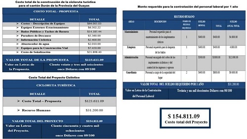 El proyecto ciclístico deberá ser financiado por las respectivas competencias gubernamentales como el MTOP, el MINTUR, el Gobierno Autónomo Descentralizado (GADS) del cantón Durán y Ferrocarriles del Ecuador Empresa Pública (FEEP), logrando que con la ayuda de estas entidades públicas el proyecto sea viable y reconocido a nivel nacional ya que es un proyecto que va a captar el interés de visita al lugar, además incentivará la práctica del deporte en unión con la recreación y el turismo.