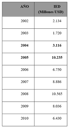 Dicha apertura de mercados por parte de Colombia, dio pie a una de las principales problemáticas del país en temas económicos, que es la falta de herramientas complementarias -como una marca país- para apoyar los procesos de apertura y generar mayores flujos entrantes de activos internacionales, que se materializan en el indicador de la Inversión Extranjera Directa -IED- en el país. Problemática reflejada en las inestables fluctuaciones de la IED en periodo 2002-2010 en Colombia, que se pueden observar en la siguiente Tabla 1: