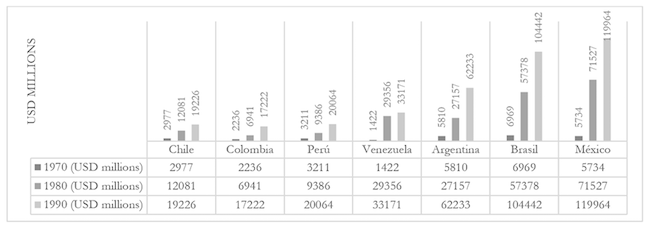 During the 60s and the 70s, Latin American states acquired substantial sums of foreign debt, particularly with the IMF for adjusting the disproportion on its balance of payments. Such imbalances were mainly caused by the inefficiency of import substitution policies that those states maintained after World War II. An example of such practices was using foreign loans to protect the state enterprises, compensating its inefficacy and making them able to compete at domestic level. In this way, the South American states were using the financial loans provided by the IMF not only to correct macroeconomic imbalances, but also to finance the public industry deficit. By 1980, most Latin America economies became immersed in economic stagflation, mainly triggered by the collapse of the raw materials markets and the US Dollar appreciation (Rangel & Soto Reyes 2012: 42).
