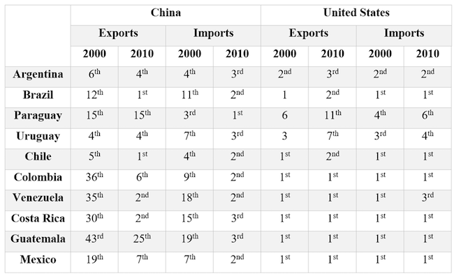 There are several factors that are contributing to the capacity of China to overstep the United States’ economic and political influence in the region. For Manriquez & Alvarez (2014: 11-12) the list includes first, the geographical conditions, in which the United States is still able to influence states with geographical contiguity, but is inefficient to maintain its control over all the states in the region. Second, the US neglect for Latin America due to its focus on the Middle East. And third, a lack of trust in the orthodox neoliberal guidelines.