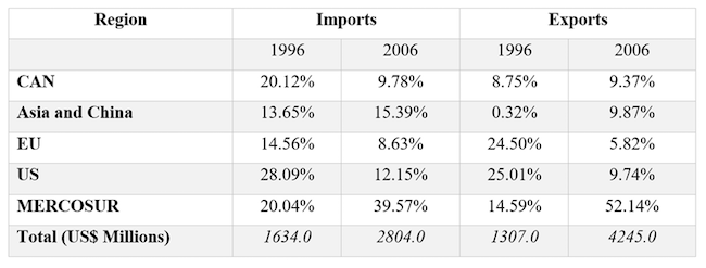 Compared to the 90s, in the XXI century, Bolivian exports have increased from US$ 1307 million in 1996, to US$ 4245 million in 2006 (INE 2007). Such increment is the result of a market diversification, as can be seen in the Figure 3. Export growth to Asia and China was especially remarkable with an increase from 0.32% of Bolivian exports share in 1996 to 9.87% in 2006. Thus, Asia has become Bolivia’s second most important trade partner in the region. On the other hand, it is possible to observe that the trade share of the US and the EU has plummeted. This situation could be a result of Evo Morales’s resolution to refuse to sign a free trade agreement with the US as well as the nationalization of European and North-American companies.