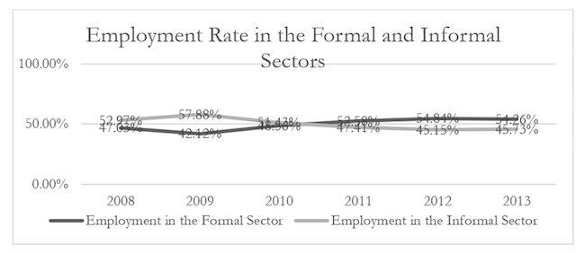 On the other hand, the new constitution of Ecuador prohibited any type of outsourcing and hourly-paid activities. Forcing private companies to provide full-time contracts with fully remunerated salaries as well as social healthcare and a 15% share of profits to workers. By 2006, 800,000 workers were part of outsourcing companies. This represented 17% of the labour force. Thus, thousands of workers were introduced into the formal sector, which grew from 38% from 2009 to 45% in 2010 (Banco Central del Ecuador 2014). The working class, as was expected, demonstrated satisfaction with these measures. However, the private sector experienced considerable downsizing. It was alleged that it was unmanageable to maintain the same number of workers with this new package of benefits. This was reflected in the unemployment figures that grew from 7.9% in 2009 to 9.1% in 2010 2010 (Banco Central del Ecuador 2014), (Uquillas 2007: 37). To fight against the rise of unemployment, the government generated jobs by creating new state entities. Since 2007, six national ministries in addition to a considerable number of regional secretaries and regulatory entities, were created. This generated 110,000 new jobs between 2008 and 2014. Furthermore, in the last seven years, the minimum wage has grown 100%, from US$ 170 in 2007 to US$ 340 in 2014. In the following graphs, it is possible to notice that not only has the unemployment rate fallen, employment in formal sectors has grown too. This could show that more workers are nowadays able to receive better work conditions, fully-paid salaries and social benefits. However, most employment generated in Ecuador has been the product of the creation of public sector entities. In 2013, 20.68% of all formal employment were bureaucrats who do not necessary generate revenue for the state. In fact, it represents an enormous fiscal cost for the state to maintain such jobs.