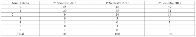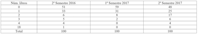 Un 44% de los alumnos no leyeron un libro durante el semestre anterior relacionado con tareas académicas, siendo la media de lectura de libros de 0,8 por alumno.