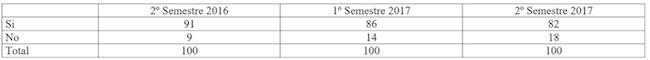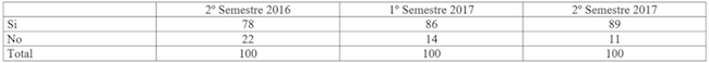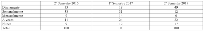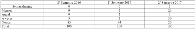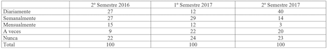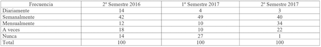Un rasgo resultante del uso y frecuencia de biblioteca es la existencia de un comportamiento similar entre el alumnado de los tres semestres, que se refleja en el porcentaje de estudiantes que recurren a la biblioteca con una oscilan que va desde el 78% al 89%. Con respecto a su frecuencia, un 20% al 30% de los mismos es bajo la modalidad de “semanal” y un 9% al 49% de forma “mensual”, junto a los que van “a veces” (14% al 32%) y “nunca” (11% al 22%).