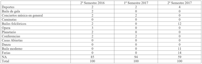 La participación en actividades culturales presenta de forma general unos porcentajes bajos, a excepción de la visita a exposiciones que oscila entre un 33% al 43%. Mientras que la evolución porcentual de alumnos que suelen asistir al teatro se sitúa entre el 16% al 26%; los alumnos que suelen acudir a conciertos de música clásica entre el 4% al 16%; los que concurren a conciertos de música moderna entre el 12% al 29%; los que suelen visitar museos giran entre el 18% al 25%; los alumnos que suelen presenciar espectáculos de ballet entre el 0% al 4%; los que suelen asistir a otras actividades entre un 6% al 20% y la frecuencia de visitas a esas otras actividades culturales señaladas por los universitarios, que se recogen en la Tabla 50, ofrecen unos escasos porcentajes y donde sobresalen las modalidades de “a veces” y “nunca”.