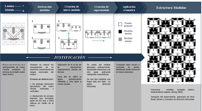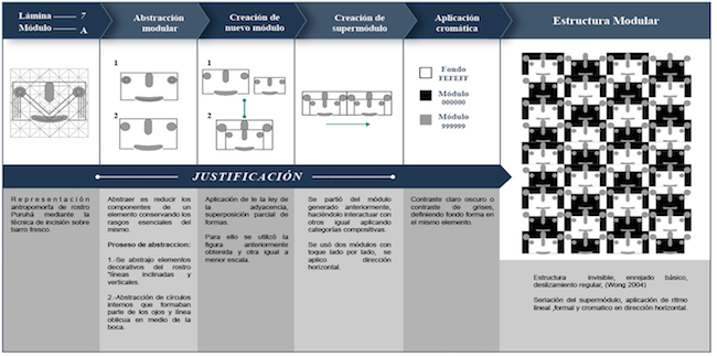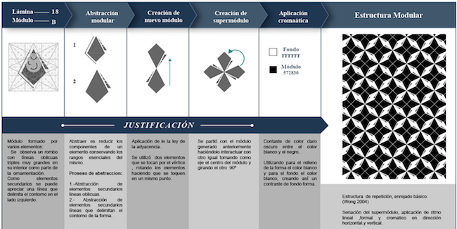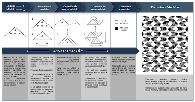 Esta matriz, sigue una metodología secuencial para la creación de nuevos módulos y súper módulos, como se puede apreciar en la figura 1, la misma consta de seis columnas y dos filas. En la primera columna encontramos el módulo tomado del banco de las piezas de estudio. En la segunda columna se realiza un proceso de abstracción modular. En la tercera, se trabajó bajo la ley de la adyacencia, para la creación del módulo. En la cuarta columna se aplicó las categorías compositivas, para la generación de los supermódulos. En la quinta, que corresponde a la aplicación cromática, se consideró el soporte a utilizar y, en la última columna, se encuentra la seriación de los módulos, para tener como resultado el súper módulo en una estructura modular activa e inactiva en ciertos casos.