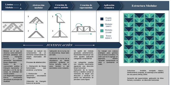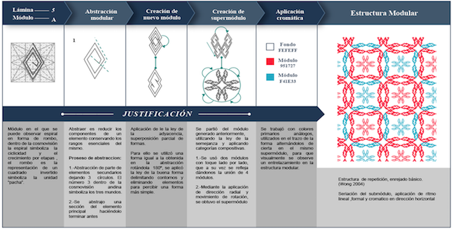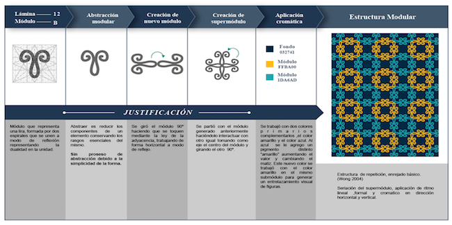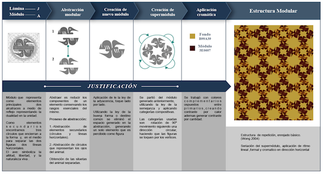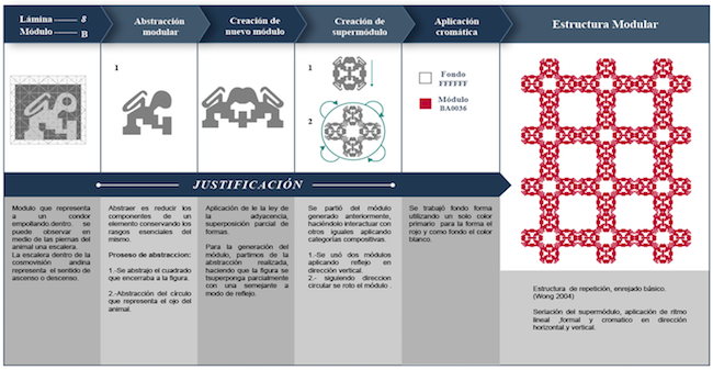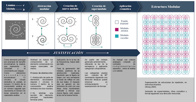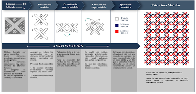 Adicionalmente se trabajó con una matriz de generación modular, en la que se utilizó leyes y categorías del diseño, que permitan un desarrollo técnico del objetivo de la investigación. Se aplicó teorías del diseño bidimensional planteados por Wong (2004). También se aplicó las leyes de la Gestalt, detalladas en el acápite de introducción. Destaca la utilización de la ley de la adyacencia, misma que presenta múltiples posibilidades para generar varias propuestas. Esta ley, conjugada en ciertos casos con otras leyes, permitió la generación de nuevos módulos. Para los supermódulos se trabajó con categorías compositivas en estructuras modulares activas e inactivas con enrejados básicos, experimentando con criterios como: dirección, ritmo, movimiento, simetría y equilibrio. Por último, para la aplicación cromática, se tomó en consideración el soporte en el que se va a aplicar el diseño, dentro de un contexto contemporáneo.