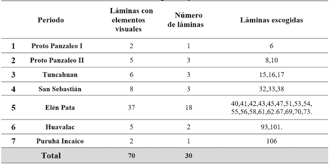 Hernández, citando a Danke afirma que “los estudios analíticos descriptivos buscan especificar las propiedades, las características y los perfiles importantes de personas, grupos comunidades o cualquier otro fenómeno que es sometido a un análisis” (Hernández, Fernández y Baptista citado en Pereira 2011:23). En el caso de estudio, se describieron las piezas seleccionadas, para lo cual se utilizó una tabla inventario, que permitió, mediante la técnica de observación, descartar láminas de piezas cerámicas con carencia de elementos visuales. Al poseer un número extenso de material a analizar, se trabajó una línea de tiempo, misma que tomó como base la división cronológica de los siete periodos culturales propuestos por Caamaño. Esto con el fin de reducir el número del material a estudiar, dejando como resultado, 30 láminas que están descritas en la tabla 1, que se priorizaron para la investigación.