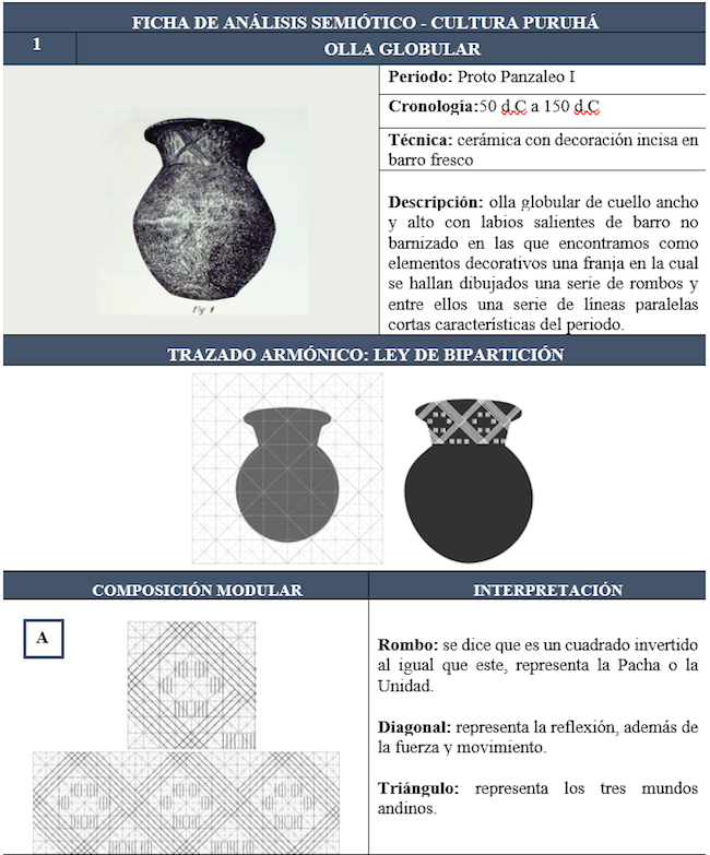 Se desarrolla como metodología la ficha de análisis semiótico, utilizada para recolectar datos relevantes como: periodo, cronología, técnica utilizada para la decoración. Además, las fichas permitieron determinar el tipo de trazado armónico y la digitalización de los módulos. Cabe resaltar que el proceso es gráfico, no obedece a criterios de la Arqueología, sino que constituye una digitalización formal de las piezas analizadas, bajo parámetros técnicos propios del Diseño, basados en sistemas compositivos de la semiótica andina.