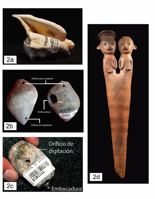 Instrumentos cuya construcción y potencia permiten el desplazamiento entre escalas, facilitando así la creación de ritmos y melodías. De sonidos agradables, pueden ser de diversos tamaños y materiales, como por ejemplo el silbato antropomorfo en la Figura 3a.