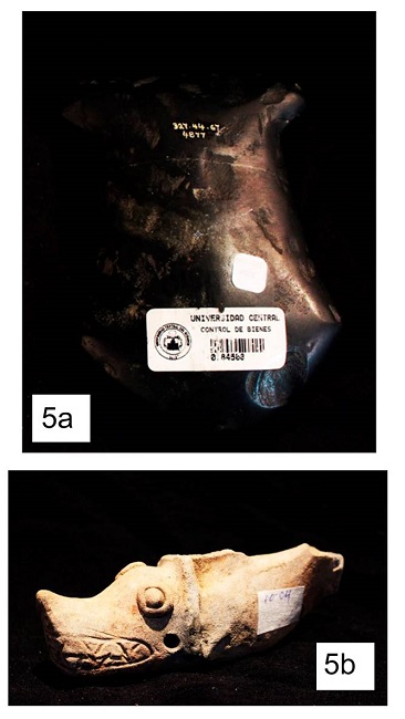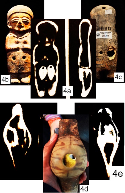 La Sacrificada (Figura 4c) es una pieza de la misma configuración y cultura que Dulzona (Figura 4b) que se encuentra fisurada y presenta un proceso de restauración moderna. Nos muestra una abertura en su parte posterior que permite visualizar su sistema interno. Podemos encontrar que el cuerpo se encuentra hueco y que la cara frontal del objeto se conecta con la cara posterior por dos conductos tubulares que atraviesan trasversalmente la pieza a la altura de la cintura. Estos ductos crearán los cuatro orificios de digitación (dos a cada lado del instrumento).