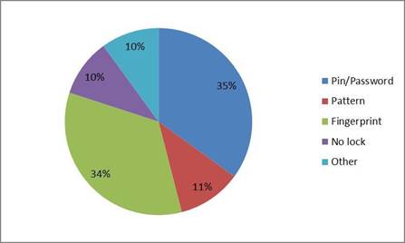 Figure 1 is a multiple selection question where students were tasked with selecting what type of security measures they have in place to lock their phone. 34.97% responded that they use a personal identification number (PIN) password to access their phones; the second most used phone lock was the fingerprint scanner with 33.75% of students. The next three responses all have similar results: the use of a pattern received 11.19% of responses; 10.49% of students do not lock their phones; and 9.79% of students stated they used face identification.