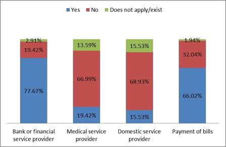 Figure 3 describes whether students have online accounts. For online accounts that involve payments or transactions, 66% stated that they used them, and 32% of the students stated no. 2% of respondents said that the question did not apply to them. With online utility accounts, 69% of students stated they did not have one, while 15.5% said yes and 15.5% said that such online account did not apply to them.