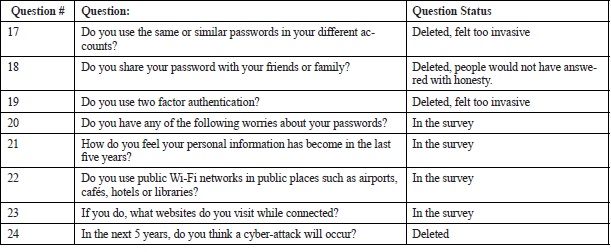 Following that question, there was one about how frequently students used the internet, and another question asking if they owned a smartphone. Since most pilot responses were the same, and the questions did not provide essential information for this study, we removed those questions too. Additionally, we removed questions regarding people’s use of social media and questions about how they handle their passwords across different sites. The purpose of removing these questions was to ensure that the survey was clear and understandable, and that people would feel comfortable and fill it out correctly.