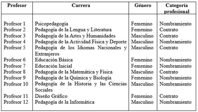 Se desarrolló en la Facultad de Ciencias de la Educación, Humanas y Tecnologías de la Unach. Se realizó una entrevista a profundidad, estructurada con preguntas abiertas a 12 profesores de las diferentes carreras de la mencionada facultad. La muestra fue no probabilística y se basó en la elección de sujetos que nos permitirían realizar una comprensión e interpretación más profunda del tema (Martínez 2014), en la que se tomó en consideración los siguientes criterios: el área disciplinar, la carrera de pertenencia y el género, como se puede apreciar en la Tabla 1.