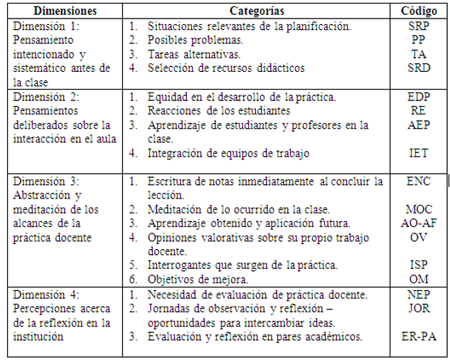 Las siguientes fueron las dimensiones y categorías de análisis establecidas, referente a la reflexión de la práctica docente que desarrolla el profesor universitario: