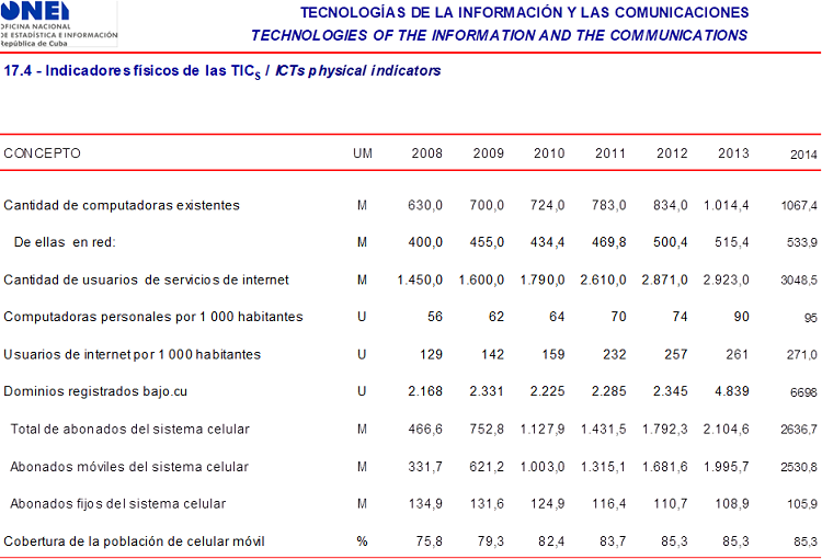 Como se aprecia, los datos que aparecen son tomados de la única fuente oficial disponible al respecto, la Oficina Nacional de Estadísticas e Información (ONEI) y el último año al que corresponden es el 2014, por lo que presentan un atraso de año y medio, como mínimo. Se reportan casi un millón y setenta mil computadoras en todo el país (Es bueno que el lector conozca que la población cubana está rondando los 12 millones de habitantes). De ellas, hay un poco más de medio millón conectadas en red (se infiere que son fundamentalmente redes locales).