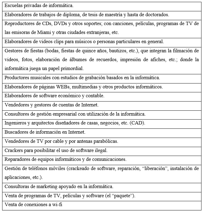 Muchas de estas empresas legales e ilegales poseen y utilizan computadoras, muchas veces no registradas y también acceden a Internet, aprovechando el mercado negro de estos servicios que ha funcionado en el país durante años. Ahora, con las áreas de wi-fi, esta utilización puede potenciarse en el sector privado. La Tabla 4 muestra una lista de las empresas privadas que utilizan la informática.