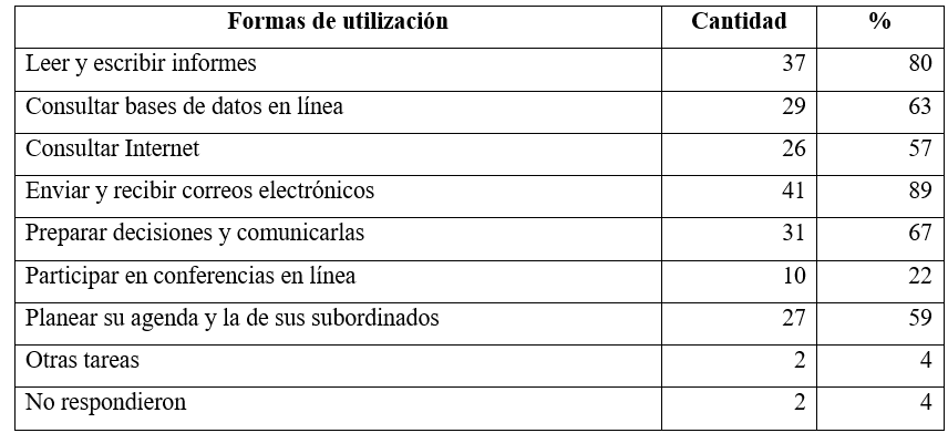 Con relación a la utilización de Intranet (en cierto sentido, una extensión “hacia adentro” de Internet (tabla 2), 43 encuestados respondieron que disponen de ella en su organización y 3 que no. De esos 43, 24 (52%) expresan que la utilizan, 10 (22%) que no lo hacen porque no contiene la información que necesitan, 4 (9%) porque no la han estudiado para saber cómo emplearla y 6 (13%) que no están habituados a usarla. Hay una mayoría (52%) que está a la vanguardia tecnológica, pero una significativa minoría (48%) todavía está ajena a ella.