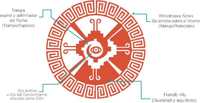 Cumpliendo los pasos determinados en la metodología de Archer (2000), se procedió a seleccionar la idea mejor conceptualizada. En consenso se aprobó la expuesta en la figura 3; pero se consideró tomar en cuenta elementos icónicos conceptuales de las dos propuestas descartadas. Puntualmente, el Ñawpa espiral y delimitador del Pacha (Tiempo/Espacio); el Ojo Andino u Ojo del Conocimiento, conocido como Ollín y Willodmawe Ñimin, que se enrolla sobre sí misma (abrazo/protección).