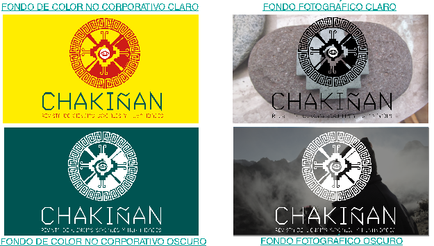Conociendo la necesidad de sustento filosófico u ontológico que requiere un identificador visual, capaz de posicionarse entre el exigente público de investigadores redactores y lectores de revistas indexadas, (Carretero 2016: 4), expresó en el primer editorial que, “Chakiñan pretende ser la puerta al diálogo que hace posible el equilibrio, el objetivo de la vida en el mundo andino. La publicación nació como alternativa de respuesta a la necesidad de establecer vínculos entre la diversidad, la pluralidad y la interdisciplinariedad del ser humano con su entorno”. Si bien la publicación nació con una identidad verbal, con una alta carga simbólica, el desarrollo de la identidad visual y la estrategia de comunicación fue el trabajo encargado al equipo creativo.