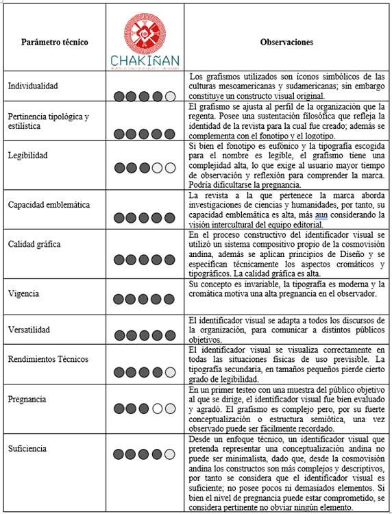 El identificador visual de la marca Chakiñan cumple satisfactoriamente con 10 parámetros técnicos; un consistente punto de partida para la consolidación de la imagen y el posicionamiento entre sus públicos objetivos. Refleja la identidad de la revista a la que identifica y los valores de los gestores de marca. Utiliza elementos singulares tanto en el fonotipo, el logotipo como en el grafismo, lo que garantizará su reconocimiento y pregnancia.