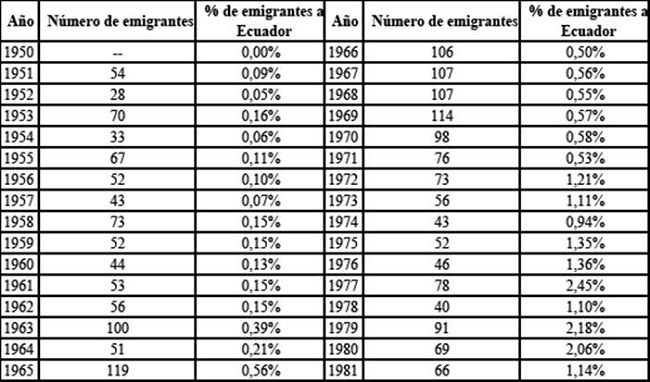 La República del Ecuador ha estado al margen de las grandes inversiones de las empresas españolas, y, por lo tanto, de sus movimientos migratorios. Esto se debe a su situación geográfica, a la reducida extensión de su territorio, a la baja expectativa de éxito de los emigrantes, a el bajo crecimiento económico del país, y a la carencia de políticas públicas que favorecieran este fenómeno como sí ocurrió en países vecinos como Venezuela, Argentina, seguidos de México, Brasil, Uruguay, Chile, Colombia y Costa Rica. De acuerdo a las tablas estadísticas del Instituto Español de Inmigración (IEE), las personas que tuvieron como destino Ecuador fueron pocas en términos comparativos en relación con otros territorios latinoamericanos. Tal y como se puede apreciar en la Tabla 1, entre 1950 y 1982 el país andino solo recibió un 0,27% del total (Calvo, Fernández, Kreienbrink, Sanz & Sanz 2009: 306).