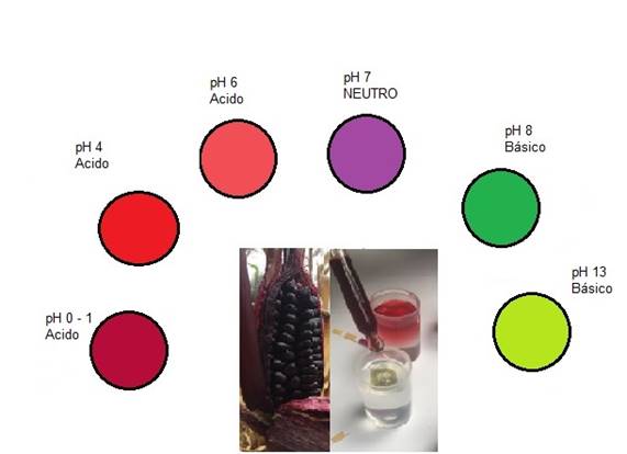 Se demuestra así que el extracto obtenido procedente del maíz morado gracias a su contenido en antocianinas, modifica su color en dependencia del pH del medio en el que se encuentra; de tal manera que en medio ácido (pH 0 a 6) toma un color rojo; cambia a un color violeta si el medio es neutro (pH 7) y varía a verde si el medio es alcalino (pH 8 a 14), cuya intensidad va disminuyendo a medida que aumenta la basicidad de la sustancia analizada.