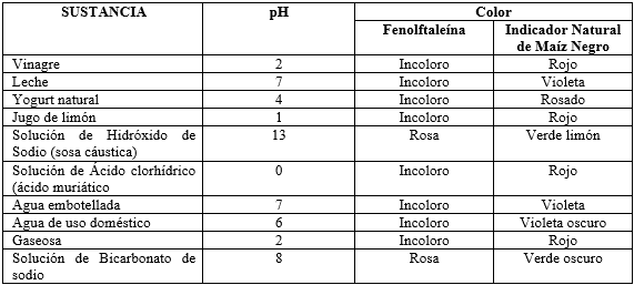 Finalizada la actividad experimental los estudiantes establecieron que el vinagre, yogur natural, agua de uso doméstico, ácido clorhídrico (ácido muriático) y el jugo de limón son sustancias ácidas; la leche y el agua embotellada son sustancias neutras y finalmente que las soluciones de hidróxido de sodio (sosa cáustica) y bicarbonato de sodio son sustancias básicas en base al cambio de coloración del indicador obtenido del maíz morado