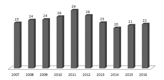 La tasa bruta de matrícula universitaria para las personas en ese grupo etario ha tenido una evolución ascendente desde el año 2008, llegando a ser 29% para el año 2011. Posteriormente, con la entrada en vigor de la prueba ENES (mérito) y del cierre de universidades con pésima calificación (calidad), la tasa se redujo hasta ubicarse en 20% para el año 2014. Desde entonces ha tenido una ligera tendencia positiva y se ubica en 22% para el año 2016. Como se indica en la Figura 1.