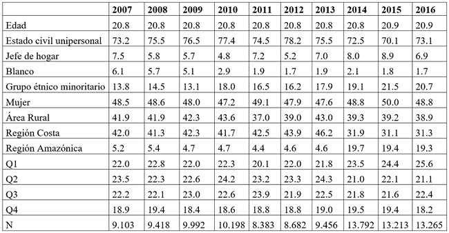 Los datos usados corresponden a la Encuesta de Empleo y Desempleo Urbano y Rural (ENEMDUR), construida por el Instituto Nacional de Estadística y Censos del Ecuador (INEC). La ENEMDUR es una encuesta de personas y hogares, y los períodos analizados corresponden a diciembre de cada año del periodo 2007-2016, con una muestra representativa para el área urbano y rural. La ventaja de trabajar con la ENEMDUR es su periodicidad; ello nos permite realizar un análisis actual de la población ecuatoriana, y estudiar su evolución en los últimos años.