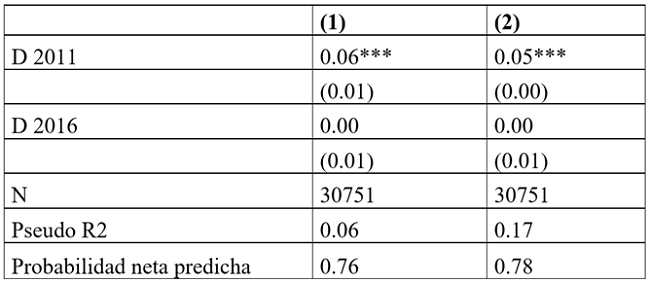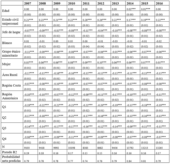 Las estimaciones del primer modelo Probit se presentan en la Tabla 2. Se realizan dos especificaciones, una contiene el efecto de los años y controla por quintiles, y la segunda especificación además incluye la edad, etnia, estado civil, género, área de residencia, y región.