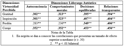 La Tabla 1 evidencia correlaciones mayores o iguales a .30 entre las dimensiones que configuran el liderazgo auténtico en autoridades y las dimensiones que caracterizan a la virtuosidad percibida en las organizaciones escolares, con excepción de la dimensión perdón (virtuosidad percibida) que presenta baja correlación con las dimensiones autoconciencia y comportamientos morales (liderazgo auténtico).