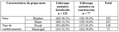 De esta forma se agrupó a directivos y autoridades educativas en dos grandes grupos con diferencias significativas entre los mismos; el primero de ellos, al que se denominó liderazgo auténtico fortalecido, agrupó a 132 integrantes de la muestra correspondientes a 63% de los casos; el segundo grupo, al que se nombró como liderazgo auténtico en construcción, aglutinó a 77 directivos y autoridades educativas que representaban el 37% de elementos de la muestra.