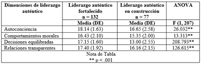 La Tabla 3 presenta las medidas descriptivas que caracterizan a las dos agrupaciones definidas, así mismo se presentan los resultados de la prueba ANOVA, que dan cuenta de diferencias significativas en las dimensiones de liderazgo auténtico presentes en cada uno de los grupos propuestos, lo que confirma su validez.