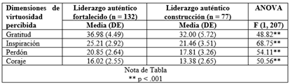 En concordancia con lo presentado se aprecian diferencias de medias en cada uno de los grupos de liderazgo con respecto a las dimensiones de la virtuosidad percibida en organizaciones escolares. Se evidencia, además, que las dimensiones coraje, perdón, inspiración y gratitud que configura la virtuosidad percibida marcan diferencias tanto con el grupo de liderazgo auténtico fortalecido como con el de liderazgo auténtico en construcción.