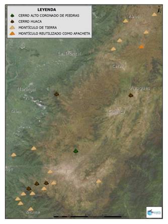 Considerando estos precedentes, este estudio se enfocará en contextos como cerros coronados de piedras, plataformas de tierra y cerros de contorno piramidal, que aparecen citados en la etnohistoria y confrontará la información, con los aislados datos arqueológicos que afloran en los documentos publicados e informes arqueológicos arriba citados y también, con la información encontrada en los sitios Guiñayzhu y Cerro Puñay (Jadán 2017; 2018).