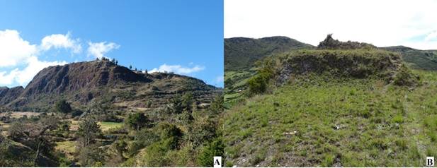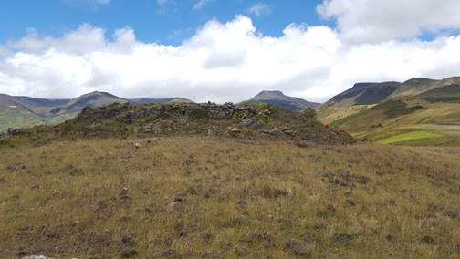 Otra estructura de tierra fue localizada al noreste de Achupallas, el sector lo llaman Chapito Loma, consiste en una plataforma de tierra de 15 m x 11 m con una estructura circular de roca de aparejo de tipo rústico de aproximadamente 1.30 m de alto, como se observa en la Figura 2 (Galarza, comunicación personal, 1 de mayo, 2019).