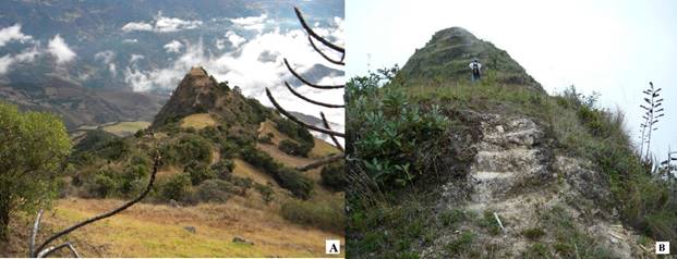 En la cima del sitio Guiñayzhu (cordillera de Chilla) existe una construcción circular en la cúspide del cerro, con el lado norte que limita al declive. Está sostenida por fragmentos de rocas rústicas de diferentes tamaños. La plataforma, que se encuentra en el nivel inferior, tiene 8.5 m de diámetro y la superficie superior tiene 6.5 m; ambas plataformas tienen 3 m de alto (Figura 3 B). También se observó al pie de la plataforma en la siguiente terraza, estratos de suelo y cerámica de una ocupación local; evidencias que corresponden a una vivienda, probablemente del cacique y su familia.