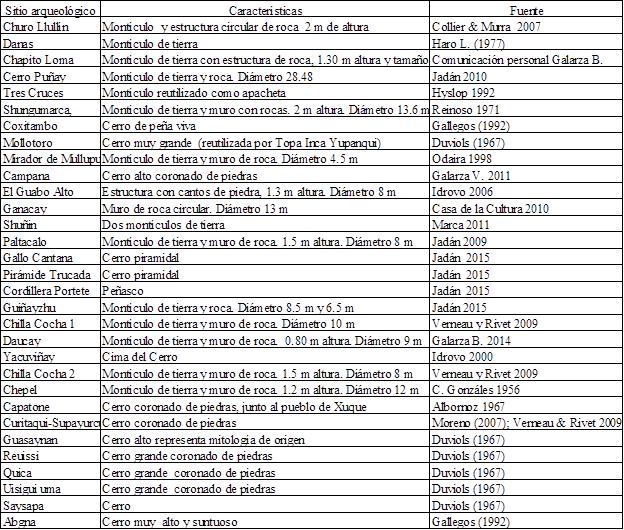 En el cerro Campana, cuenca alta del Jubones, Galarza (citado en Jadán 2015) encontró piedras en su cúspide. En tanto, en la loma de Shuñin, Marca (citado en Jadán 2015) informa la existencia de dos montículos o altares formados por varias capas de tierra poco compacta de color amarillento. Para el valle del río Cuyes y Saraguro, también se menciona la presencia de cerros con adoratorios (Salazar 2004:67).