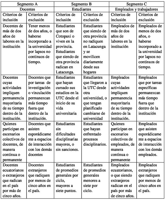 Fueron seleccionados de manera aleatoria, a través de los listados de los cursos, entre quienes tenían un promedio mayor a siete sobre diez, siempre que cumplieran con los criterios de inclusión definidos. A continuación, se presentan en la Tabla 1, los criterios de inclusión y exclusión que se usaron para cada segmento a investigar: