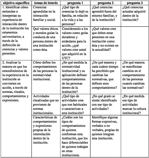 Respondiendo a estos cuestionamientos, el objetivo general que se planteó para la aplicación de esta técnica fue: Describir los aspectos más relevantes de la cultura corporativa en la UTC, desde una perspectiva de discurso simbólico. Y para alcanzarlo se partió de identificar cómo entienden e interpretan su experiencia de interacción dentro de la institución los estamentos universitarios, a través de la definición de creencias y valores presentes.