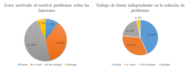 Sobre la posibilidad de responder de forma independiente los problemas sobre funciones en las clases, se constató que siempre solo el 3,3% de los estudiantes son capaces de responder por sí solos, el 20% casi siempre, un 33,3% a veces y un 43,3% nunca. Esta información ofrece datos sobre las habilidades que traen los estudiantes y los hábitos de trabajo independiente, donde hay carencias en un 76,7% de los estudiantes, que se ubican en las categorías nunca y a veces.