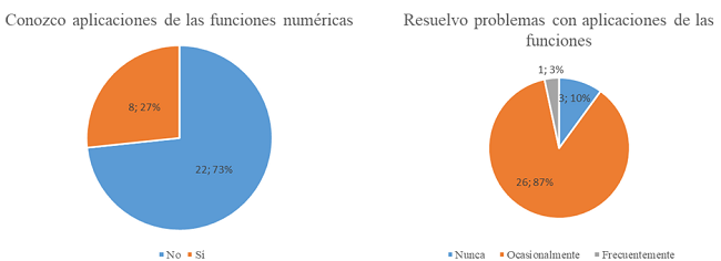 En la pregunta sobre las aplicaciones de las funciones numéricas en la vida se constató que el 26,7% conoce alguna de ellas y el 73,3% no las conoce. Este aspecto influye en el desarrollo de la investigación profundizando el interés del investigador.