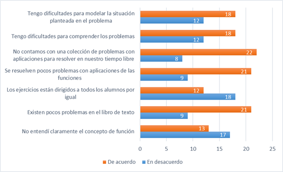 Sobre las principales limitaciones (Figura 3) que a criterio de los estudiantes afectaron la realización de problemas sobre funciones, el 43,3% de los estudiantes contestó que no entendían claramente el concepto de función, el 70,0% planteó contar con pocos problemas en el libro de Matemática de undécimo grado, el 40,0% coincidió en que los problemas están dirigidos para todos los estudiantes por igual, un 70,0% se refirió a la poca sistematización y el 73,3% destacó la carencia de una colección de problemas. Además, el 60 % reconoció dificultades al comprender el problema y modelar la situación.