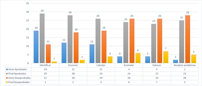 Al inicio del proceso, la habilidad más afectada es resolver problemas, pues un 93,3% de los estudiantes presentan dificultades y la menos afectada es la habilidad identificar con un 36,7% de estudiantes afectados. Según el desarrollo alcanzado en las habilidades evaluadas, se clasifican a los estudiantes en las categorías de alto, medio y bajo, obteniéndose como resultados los siguientes: bajo 73,3% de los estudiantes, medio 20,0% y alto 6,7%.
