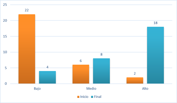 Si bien al inicio la mayor cantidad de estudiantes presentaba dificultades al identificar, enunciar, calcular, formular, esbozar y resolver problemas, con el desarrollo del proceso de enseñanza aprendizaje de las funciones numéricas mediante problemas donde se explicitan sus múltiples aplicaciones, se produce un movimiento que conlleva a que disminuya el número de estudiantes con dificultades en las habilidades que constituyen indicadores de la competencia matemática. Como consecuencia de este movimiento disminuye el porcentaje del nivel bajo y aumenta el de los niveles medio y alto (Figura 5).